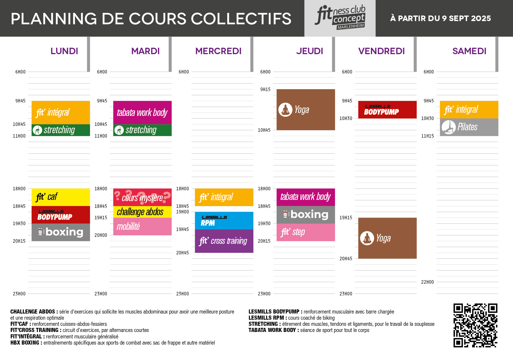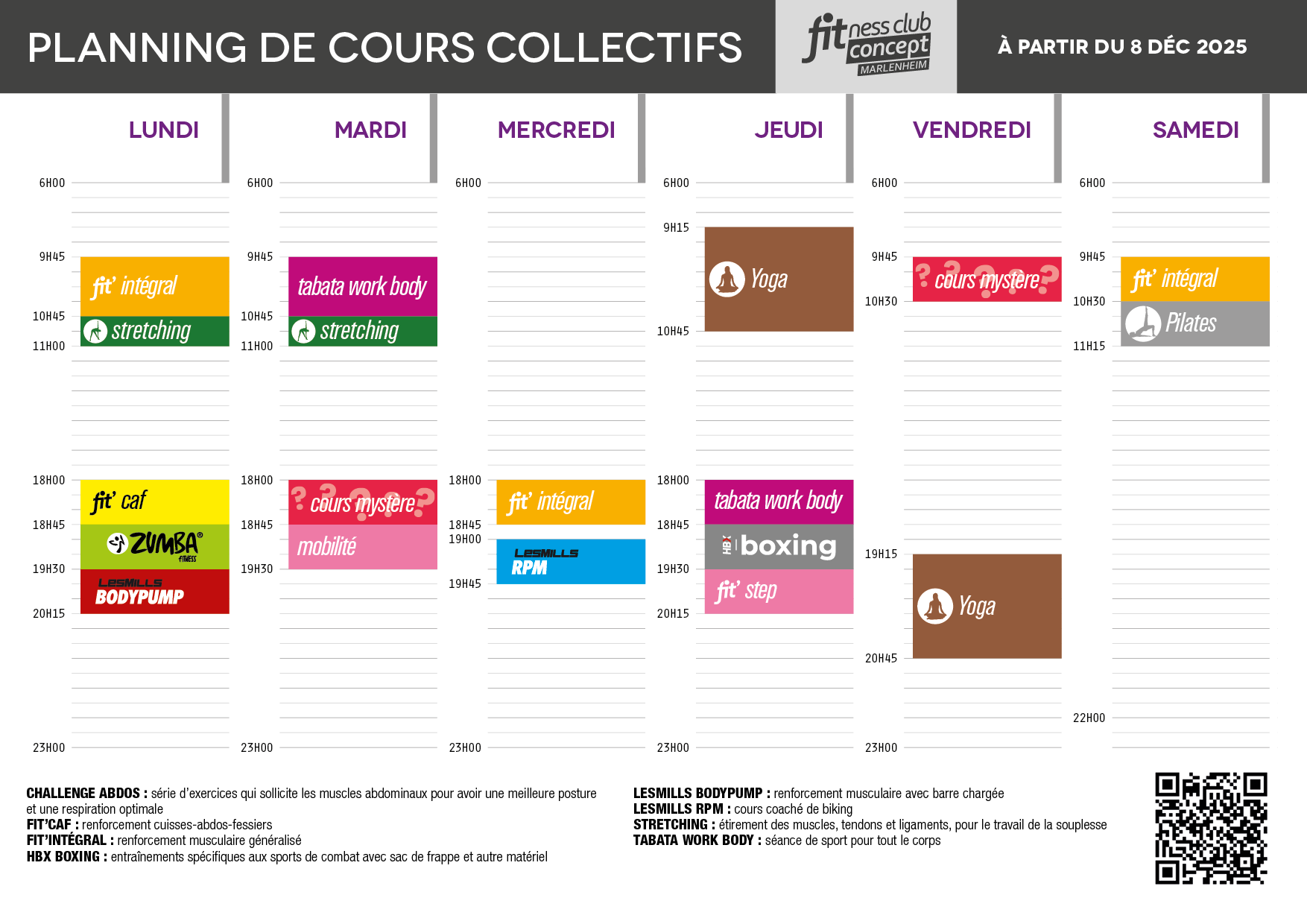 Comme tous les clubs du réseau, Fitness club concept – MARLENHEIM est ouvert 7 jours sur 7 – 365 jours de l’année. Un espace agréable, une ambiance conviviale et une équipe à votre écoute.